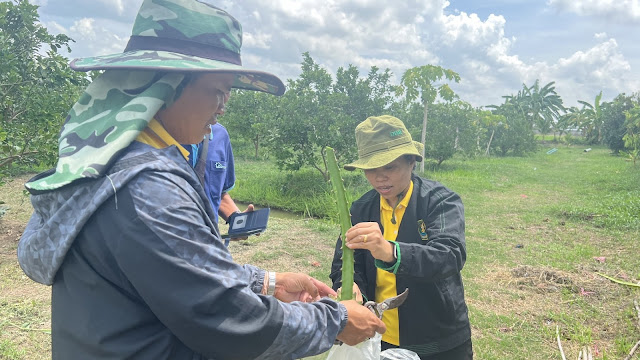 วันที่ 10 กรกฎาคม 2567 นายบพิตร ปริปุณณากร ผู้อำนวยการศูนย์ส่งเสริมเทคโนโลยีการเกษตรด้านอารักขาพืช จังหวัดชัยนาท มอบหมายให้นางสาวฉัตรนัททรี กันทะลา นักวิชาการส่งเสริมการเกษตรปฏิบัติการ และนางสิริวิมล ภูนุช นักวิชาการส่งเสริมการเกษตร ติดตามสถานการณ์ศัตรูพืชตามโครงการส่งเสริมการใช้สารชีวภัณฑ์และแมลงศัตรูธรรมชาติทดแทนสารเคมีทางการเกษตร ปี 2567 ในพื้นที่อำเภอเมืองชัยนาท จังหวัดชัยนาท พบหนอนเจาะผลฟักข้าว และเชื้อราโรคพืชบนต้นแก้วมังกร จึงให้คำแนะนำในการควบคุมทั้งวิธีการเขตกรรม การใช้สารเคมีและการใช้สารชีวภัณฑ์ในการป้องกันกำจัดอย่างถูกต้องเหมาะสมให้กับเกษตรได้นำไปป้องกันกำจัดต่อไป